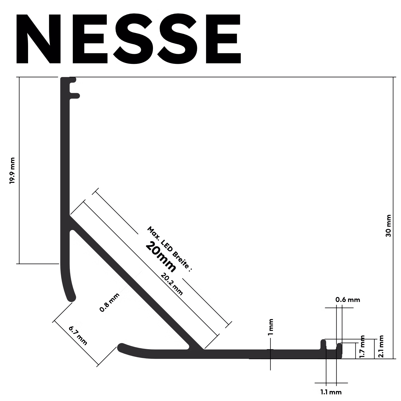Das LED Eckprofil NESSE ist das größte Aluminium-Eckprofil im Sortiment (30 x 30 mm) für LED-Streifen bis 20 mm Breite. Es vereint maximalen Innenraum mit optimaler Lichtdiffusion, professioneller Kühlung und hochwertiger Verarbeitung.