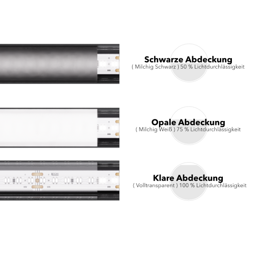 Abdeckungen in der ÜbersichtFür alle unsere Alu-LED-Profile bieten wir eine Vielzahl hochwertiger Abdeckungen aus PC (Polycarbonat) an. Diese Abdeckungen schützen Ihren LED-Streifen nicht nur vor äußeren Einflüssen, sondern sorgen auch für eine optimale Lichtverteilung. Für SLANÀ bieten wir die folgenden Abdeckungen an: