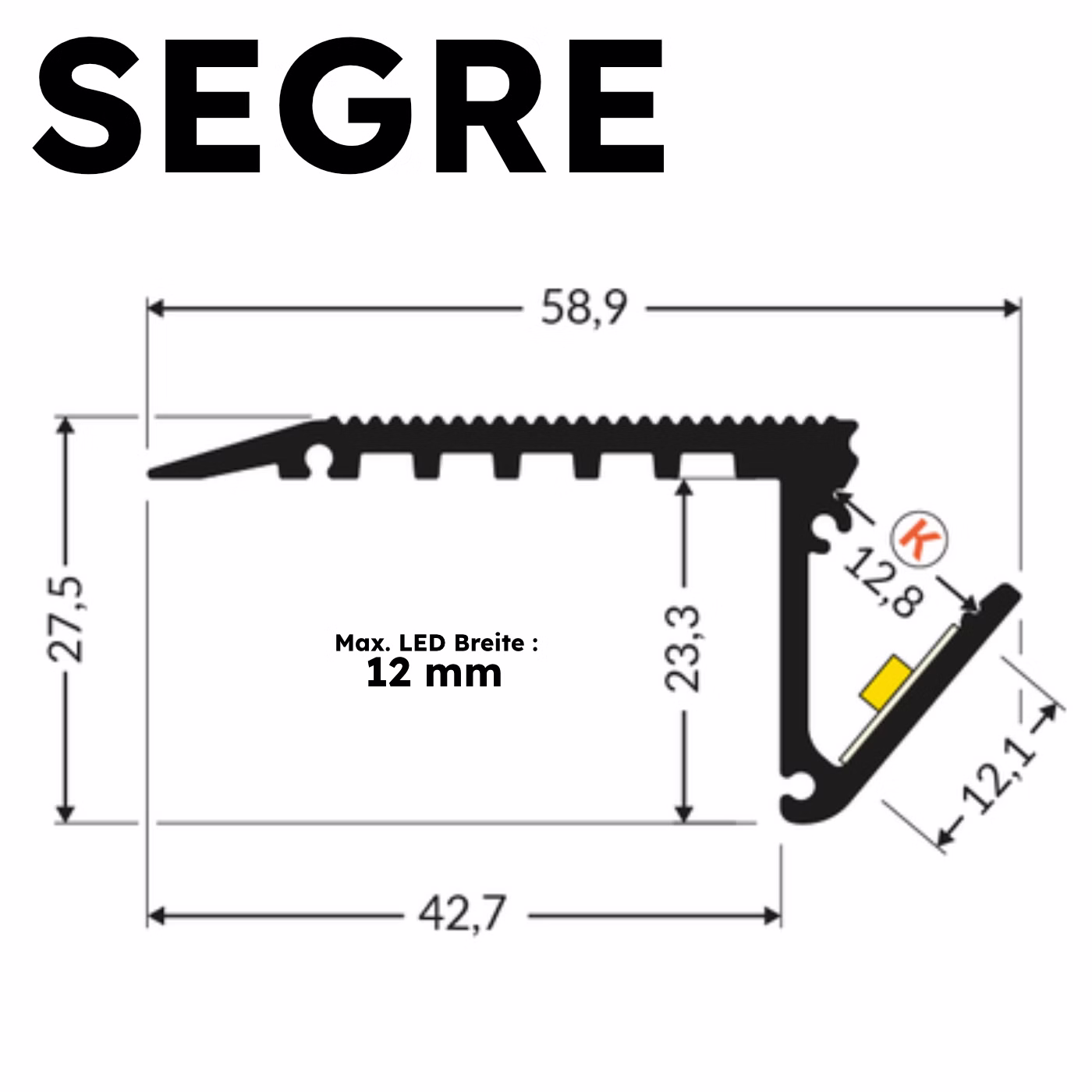 Das LED Treppenprofil SEGRE ist ein 58,9 mm breites Aluminiumprofil (27,5 mm Höhe) für LED-Streifen bis 12 mm Breite. Die integrierte rutschhemmende Riffelung auf der Profiloberseite erhöht die Trittsicherheit auf Treppenstufen – ohne separaten Antirutschstreifen. Die opale PC-Abdeckung (~67 % Transmission) erzeugt eine homogene, blendfreie Lichtlinie entlang der Stufenkante.