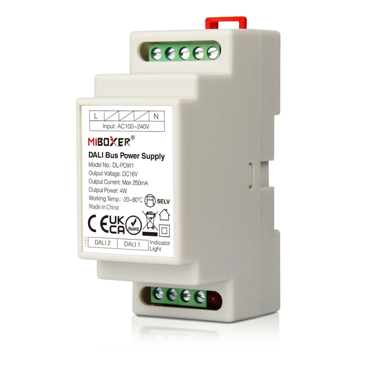 Mit der MiBoxer DL-POW1 erhalten Sie eine leistungsfähige Stromversorgung speziell für DALI-Bus-Systeme: Das Gerät nimmt eine Eingangsspannung von 100 – 240 V AC entgegen und liefert präzise 16 V DC bei bis zu 250 mA Ausgangsstrom.