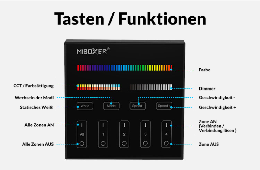 - Komfortable 4-Zonen-Steuerung: Steuern Sie mehrere Räume oder Bereiche unabhängig voneinander.