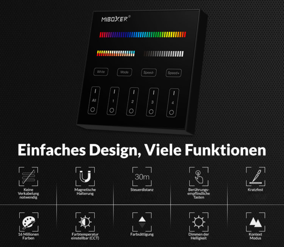 der MiBoxer B4 kombiniert modernes Design mit innovativer Funktechnik und macht Ihre Lichtsteuerung smarter, flexibler und ästhetischer als je zuvor.