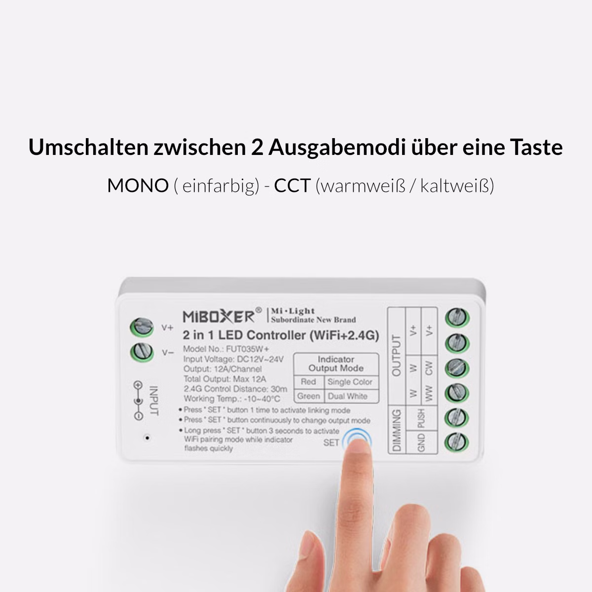 Der MiBoxer FUT035W+ LED-Controller verbindet zwei Steuerungsmodi in einem Gerät: MONO und CCT.