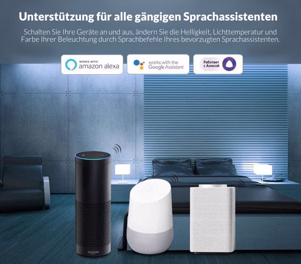 Das Gateway wird über WLAN (2,4 GHz) mit Ihrem Router verbunden. Die Steuerung ist möglich über die MiBoxer Smart App, Sprachassistenten wie Alexa oder Google Home, sowie über Automationen und Timer-Funktionen.